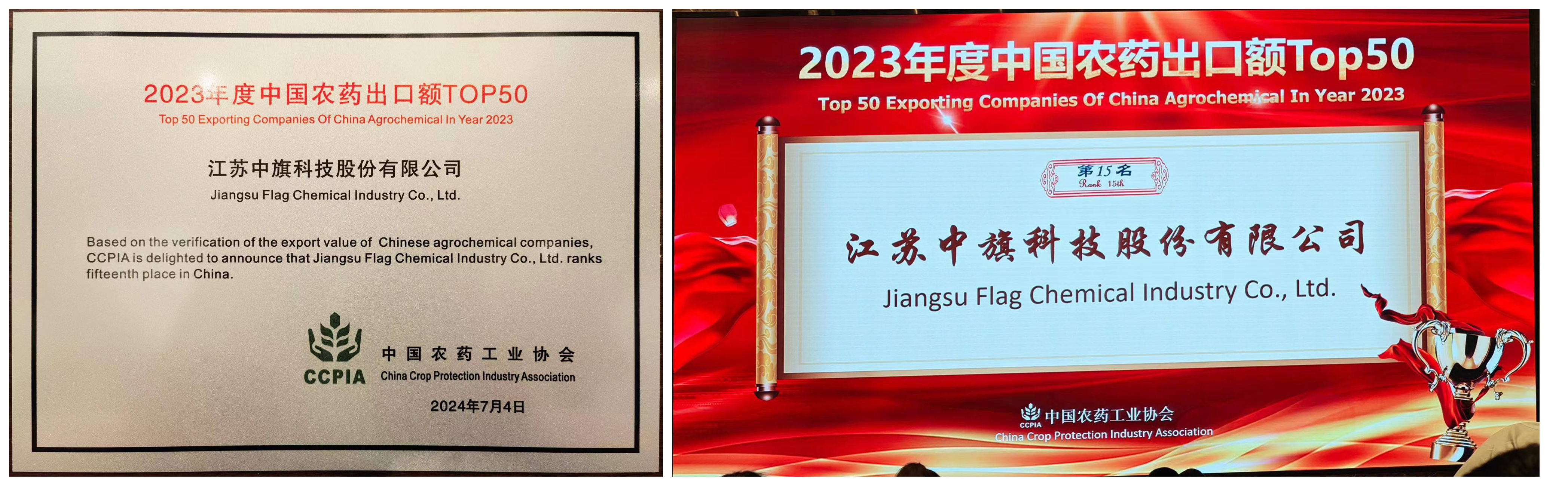 2024年7月4日,在“第十一屆中國植物保護產品國際貿易發展論壇”上,中國農藥工業協會發布2023年度“中國農藥出口額Top50”榜單,中旗科技榮獲該榜單第15名。